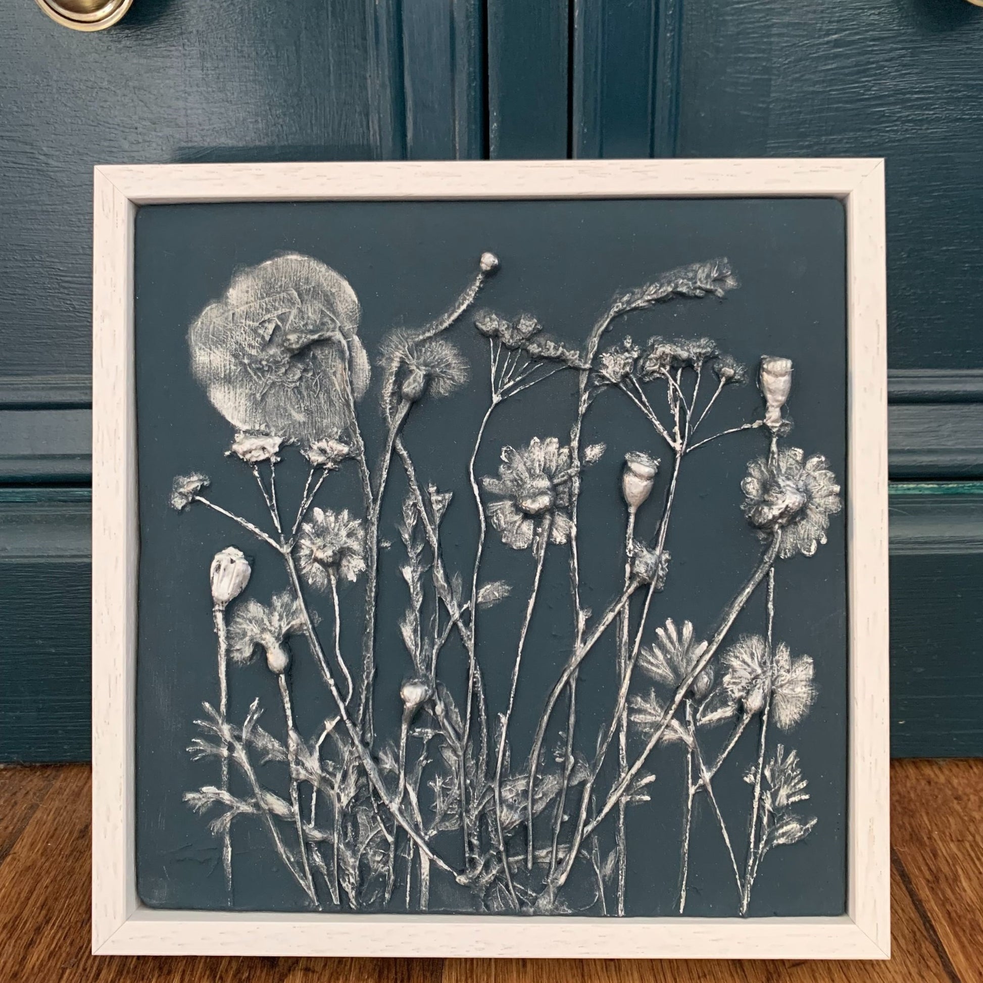 The flowers have been hand pressed into the clay, carefully removed creating an impression that will last forever, then professional plaster is poured into the clay to create a relief cast.