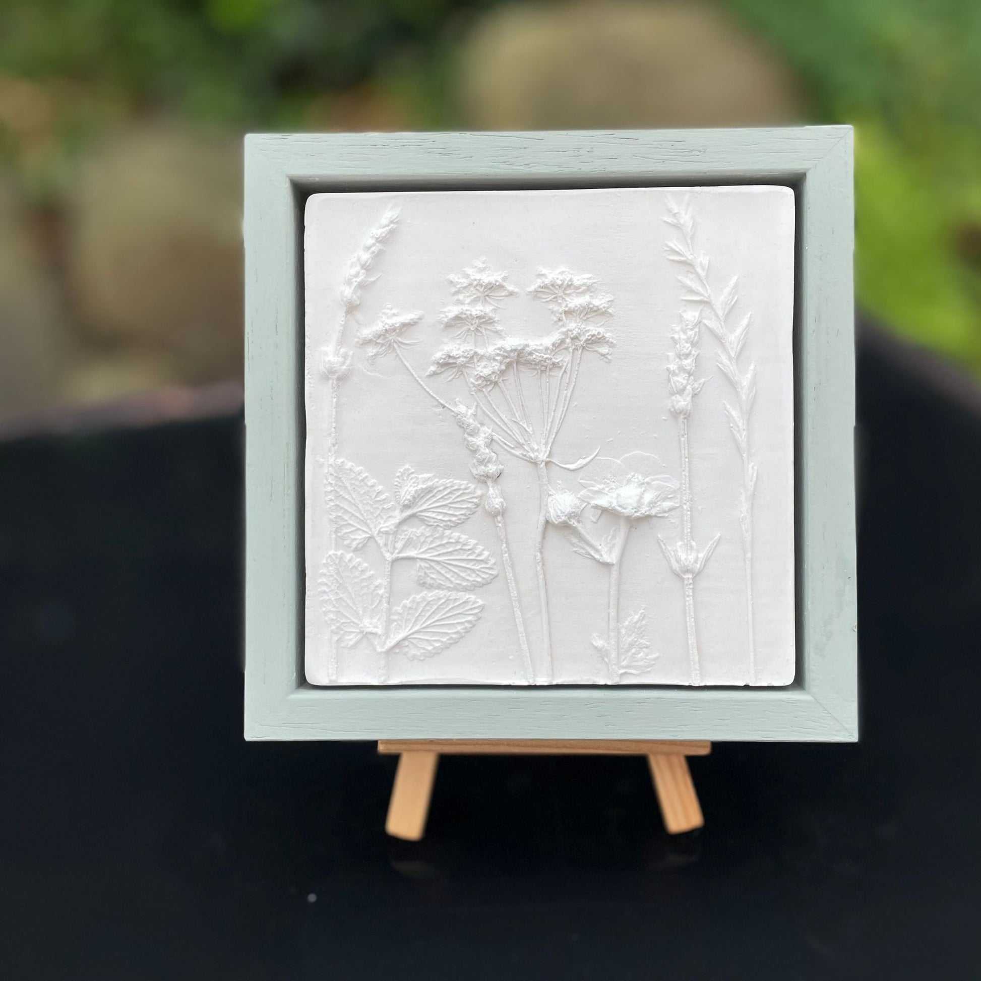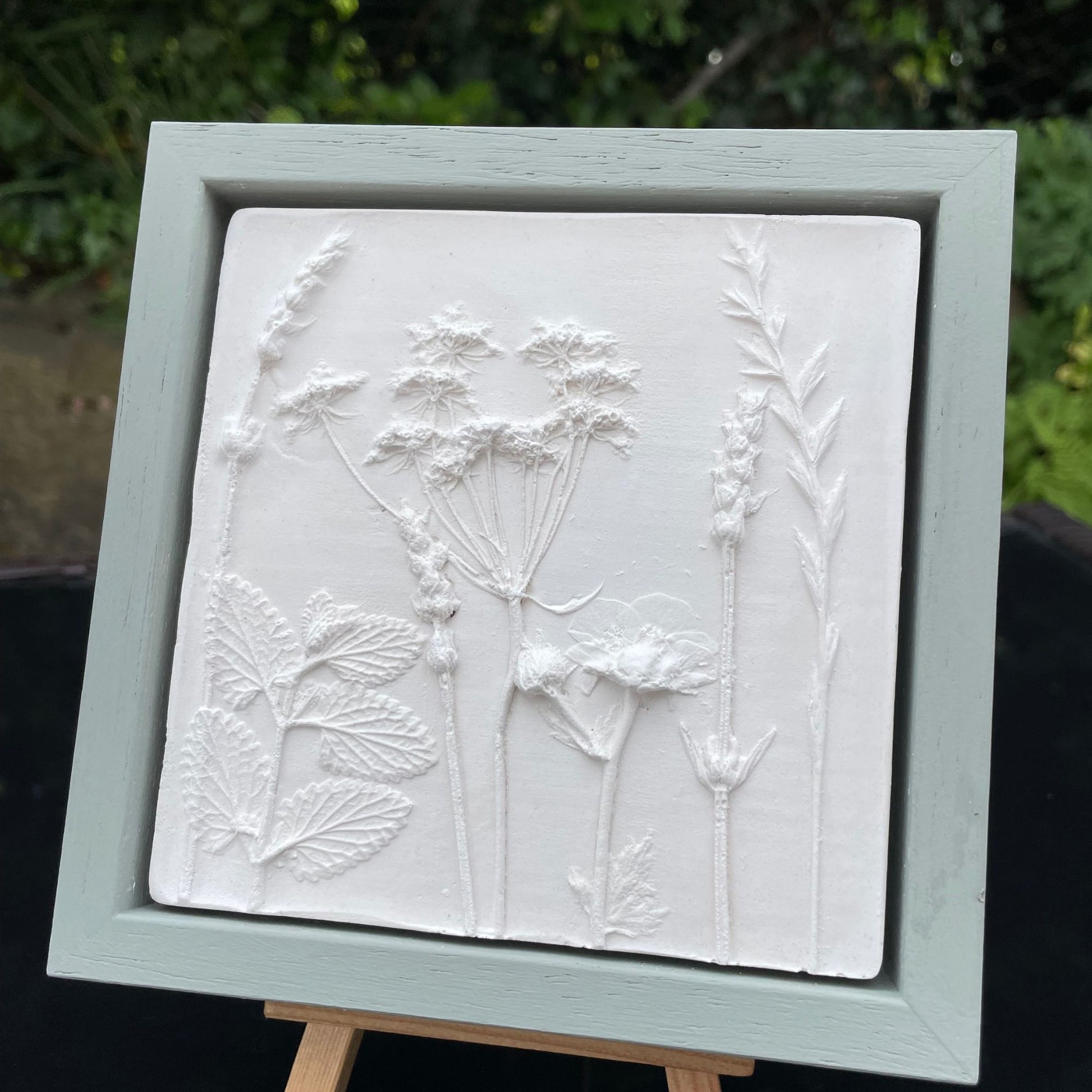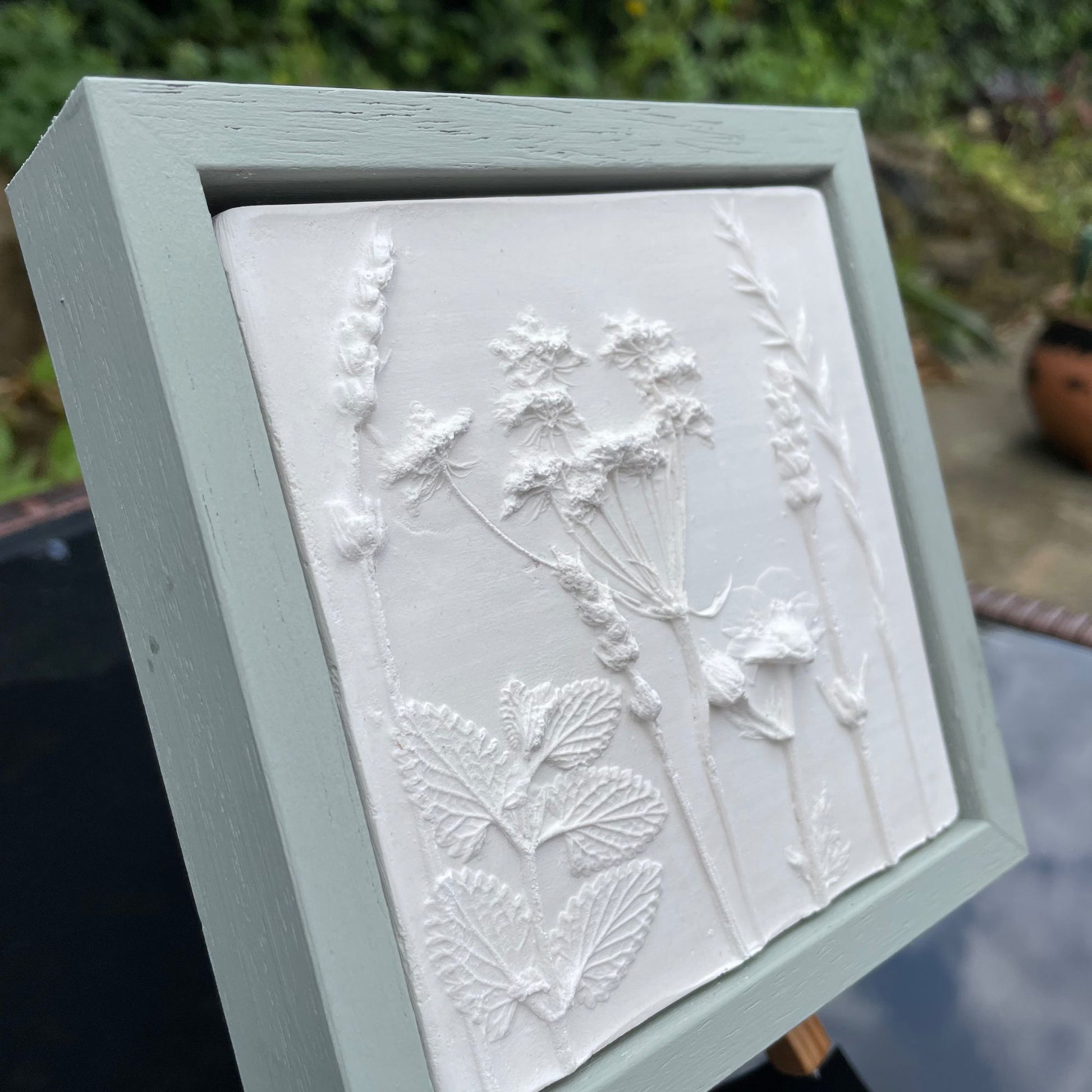 Wild flower cast featuring cow parsley, lavender, buttercup & wild grasses. Left in a natural finish and framed in a hand painted wood frame. Farrow and Ball Pigeon. Strung on reverse for hanging.