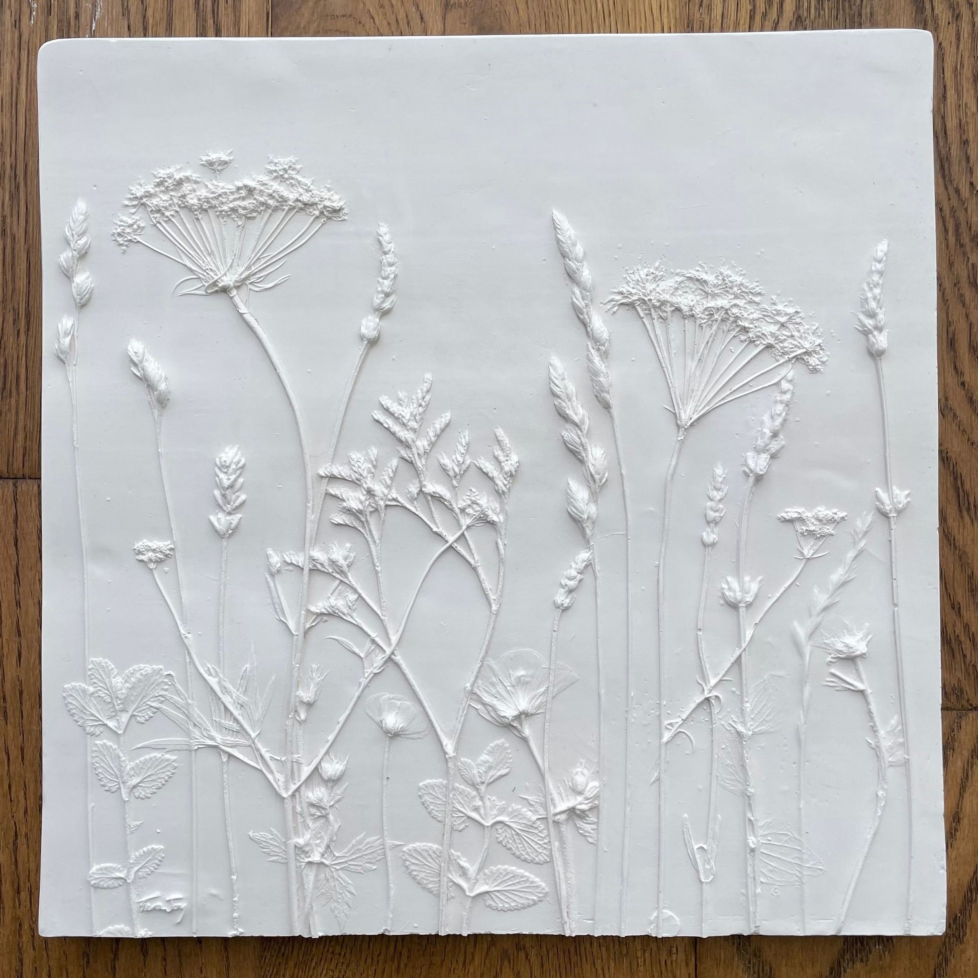 The flowers have been hand pressed into the clay, carefully removed creating an impression that will last forever, then professional plaster is poured into the clay to create a relief cast.  A hanging hook on the reverse so the piece can either hung directly on the wall or propped on a shelf.
